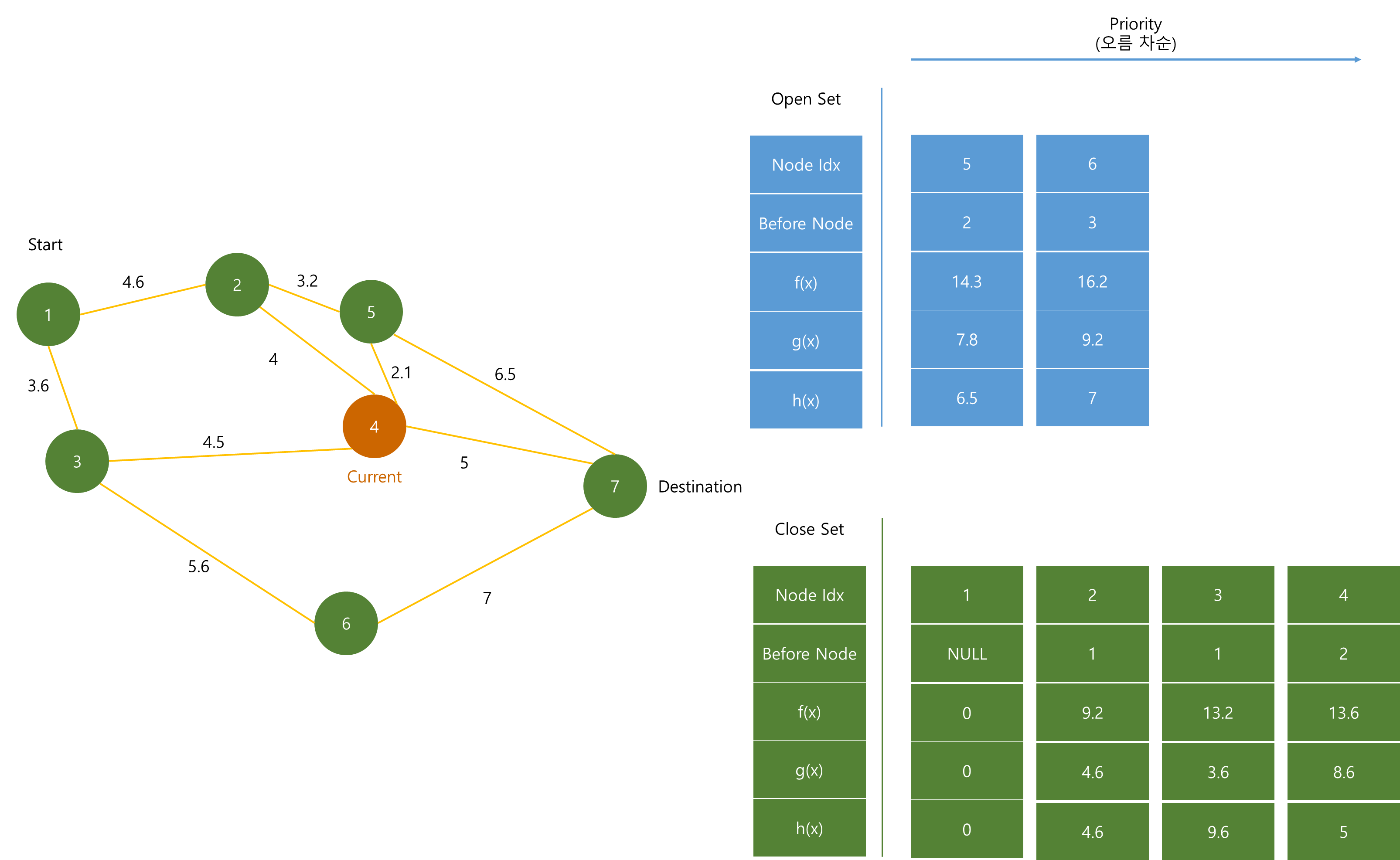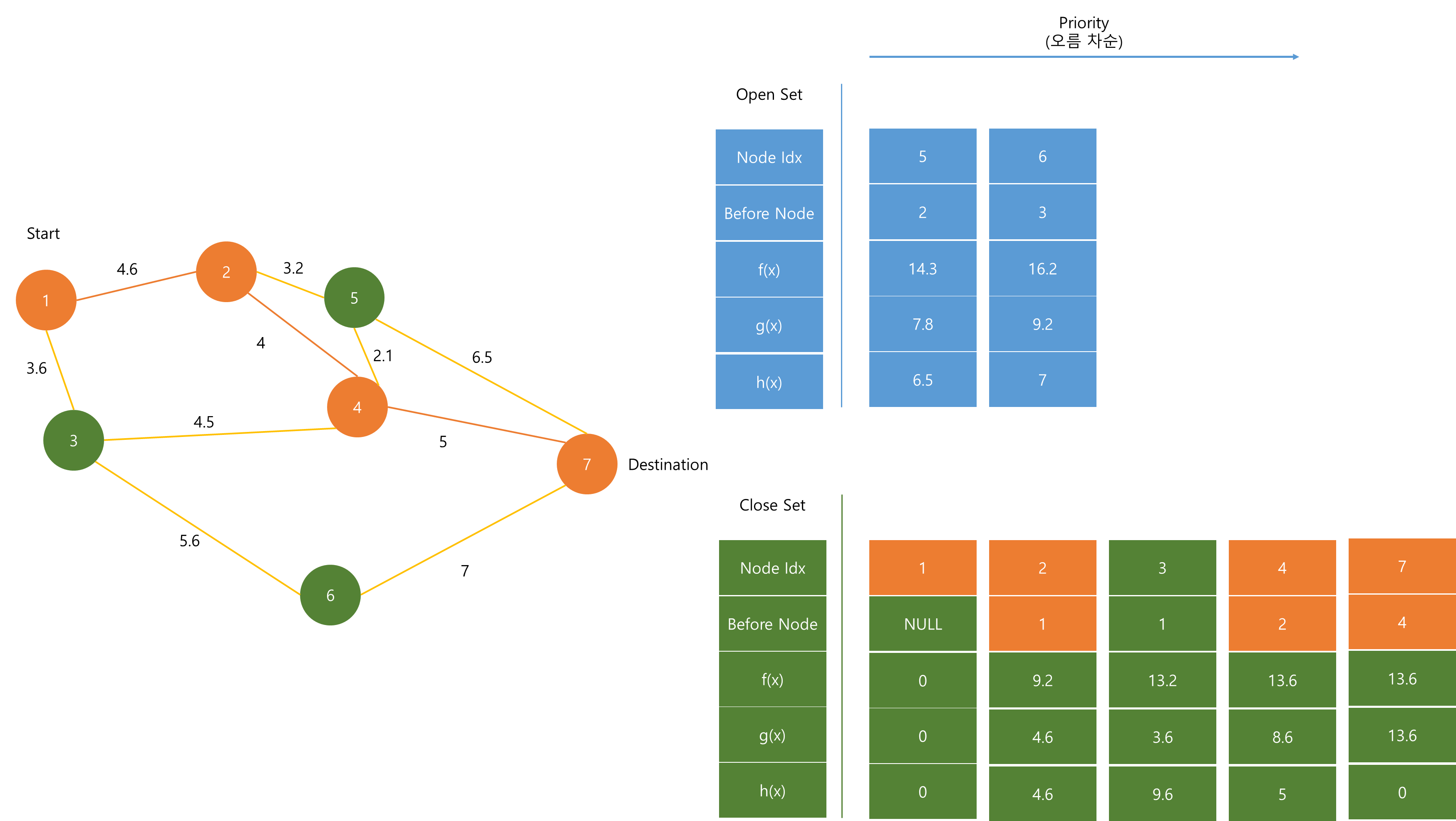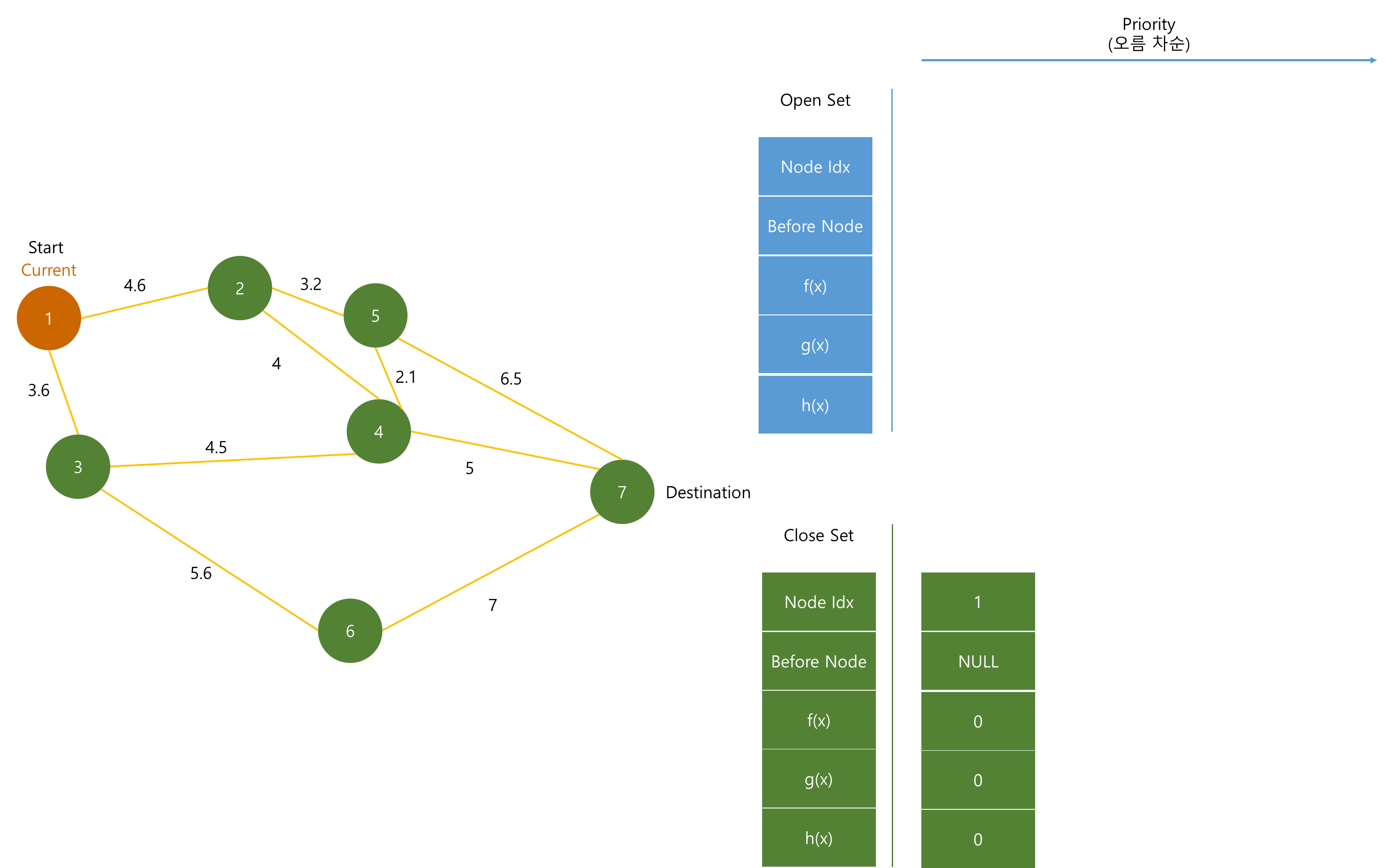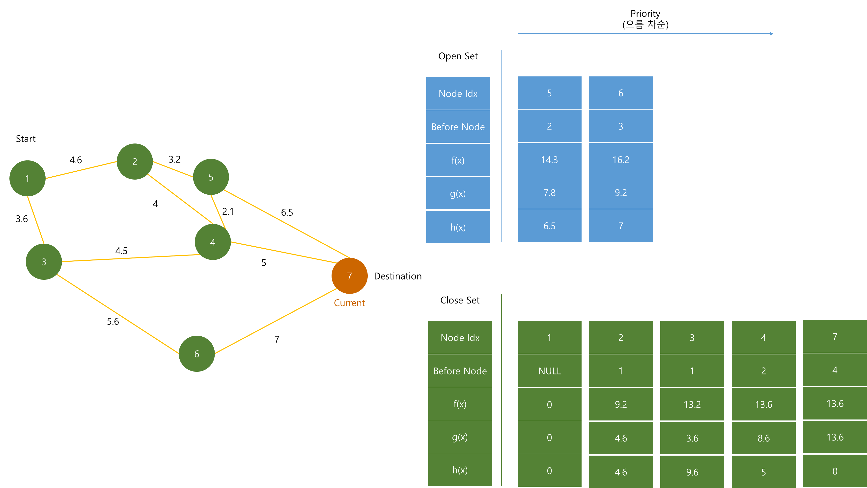 Open Set은 최단 경로를 분석하기 위해 계속해서 노드들이 추가되며, f(x)값이 작은 순서대로 저장된다.