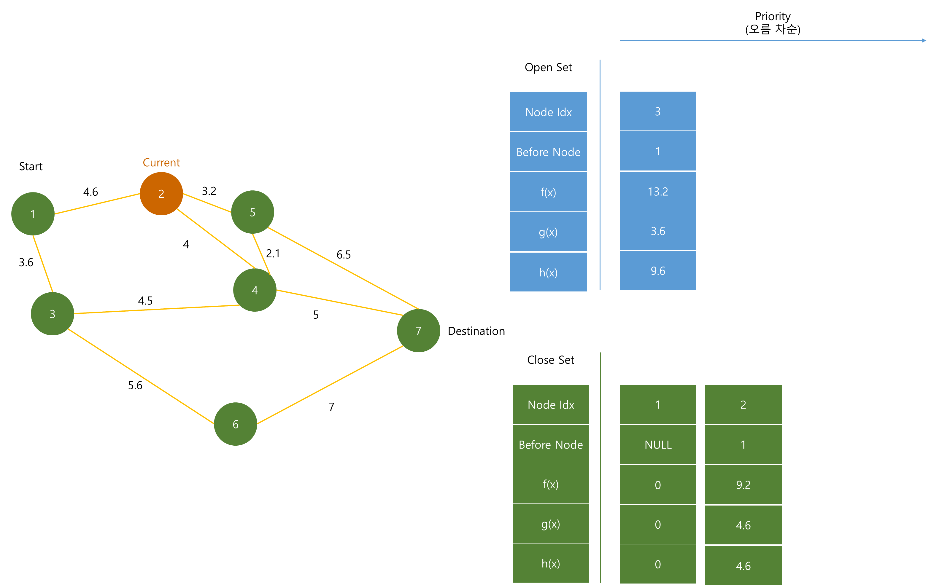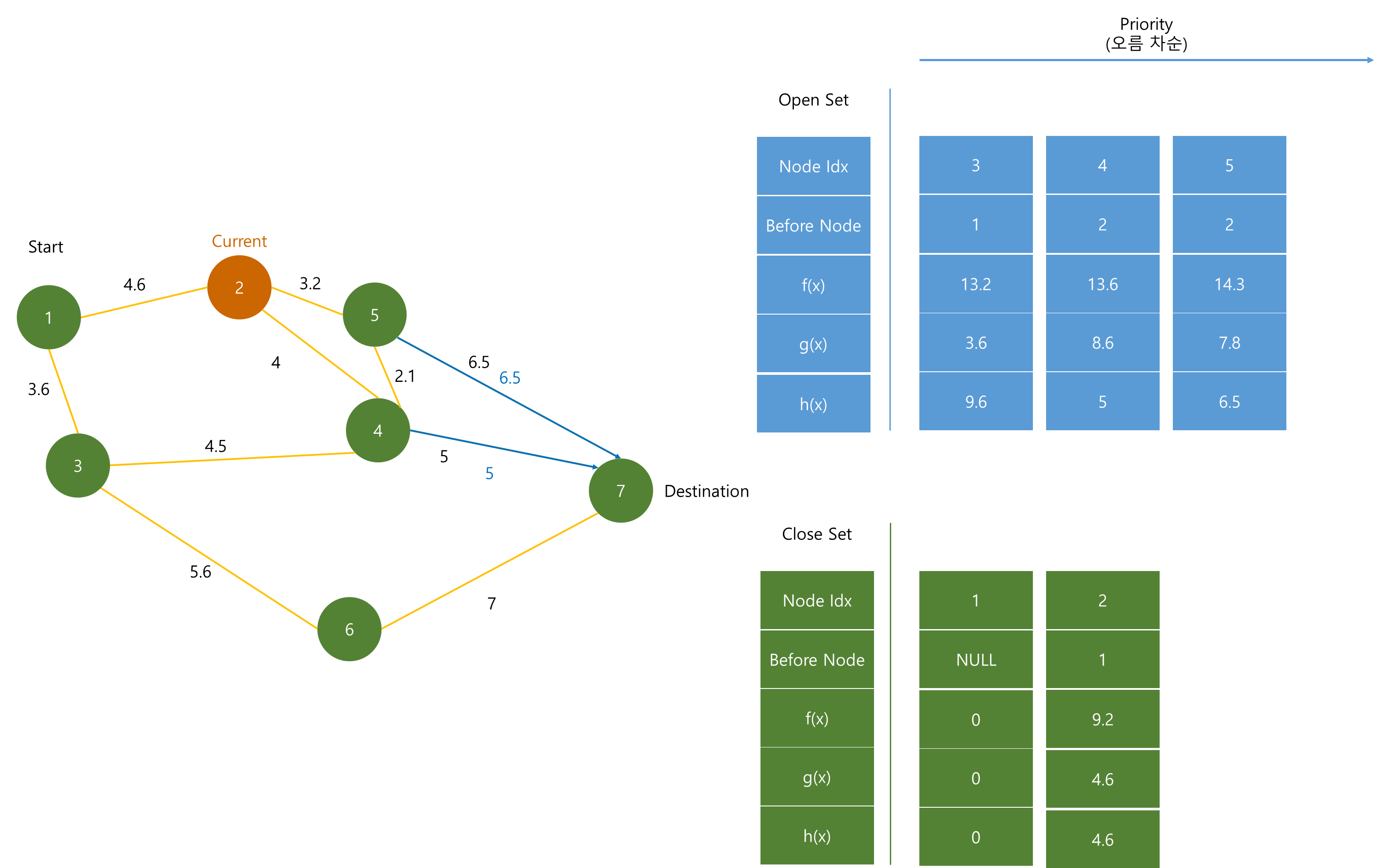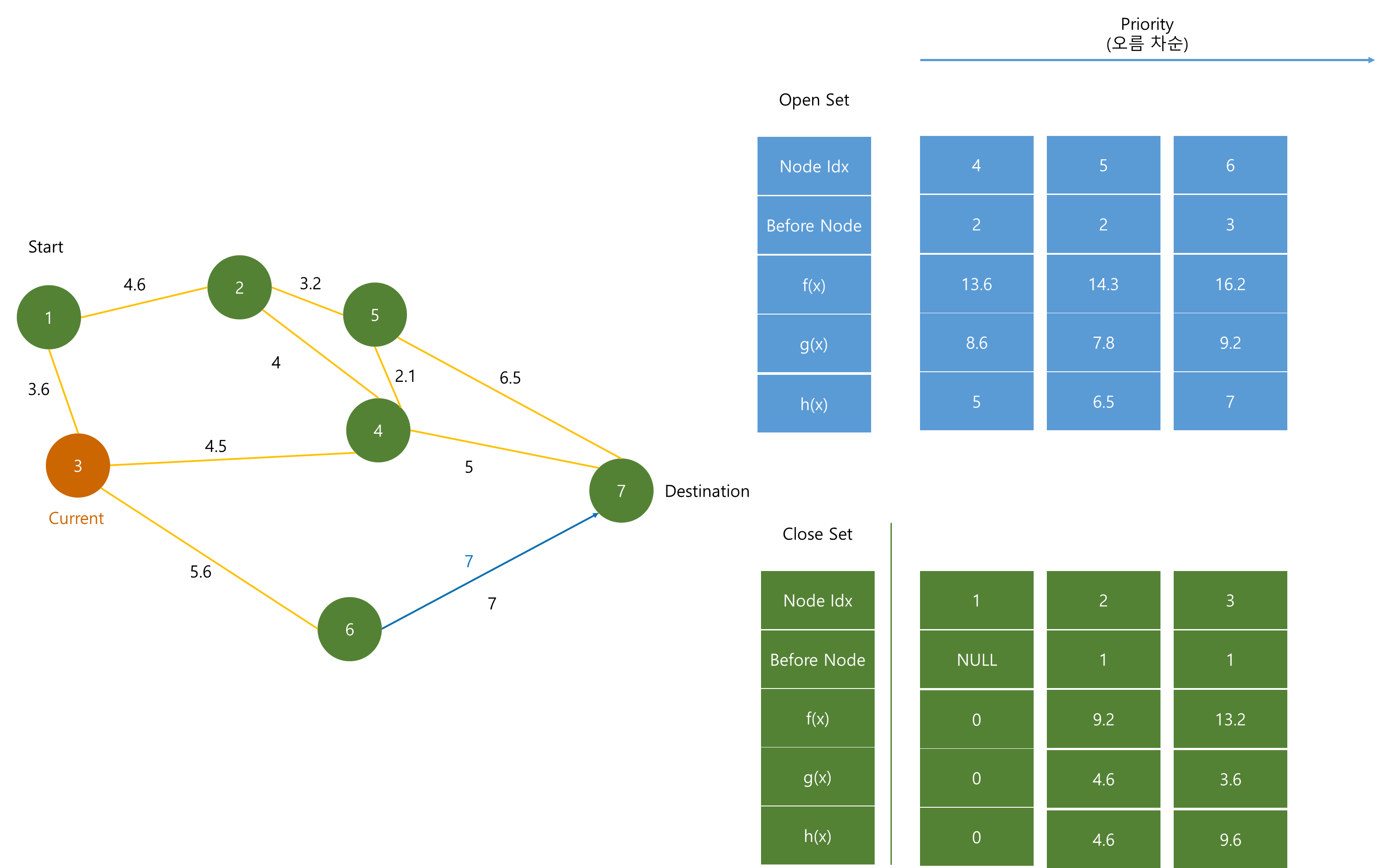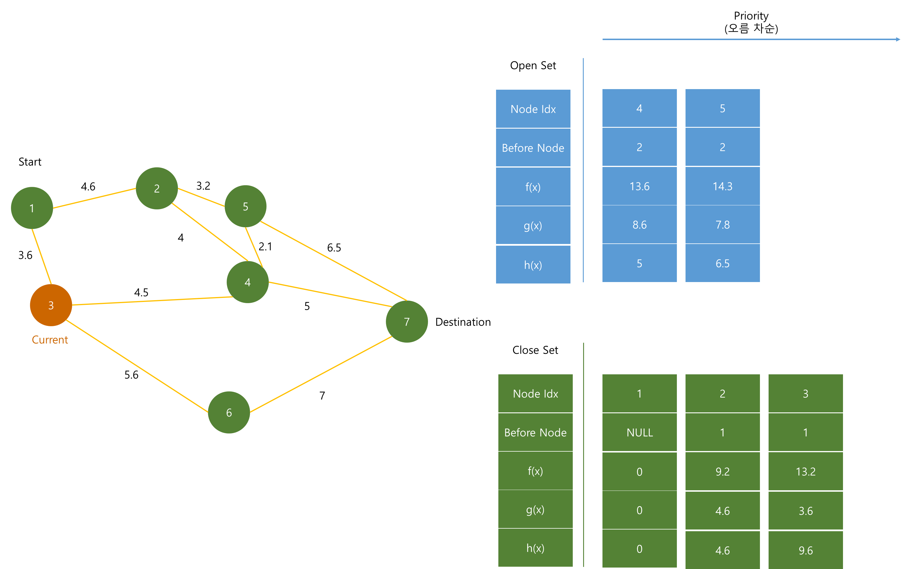 Open Set은 최단 경로를 분석하기 위해 계속해서 노드들이 추가되며, f(x)값이 작은 순서대로 저장된다.