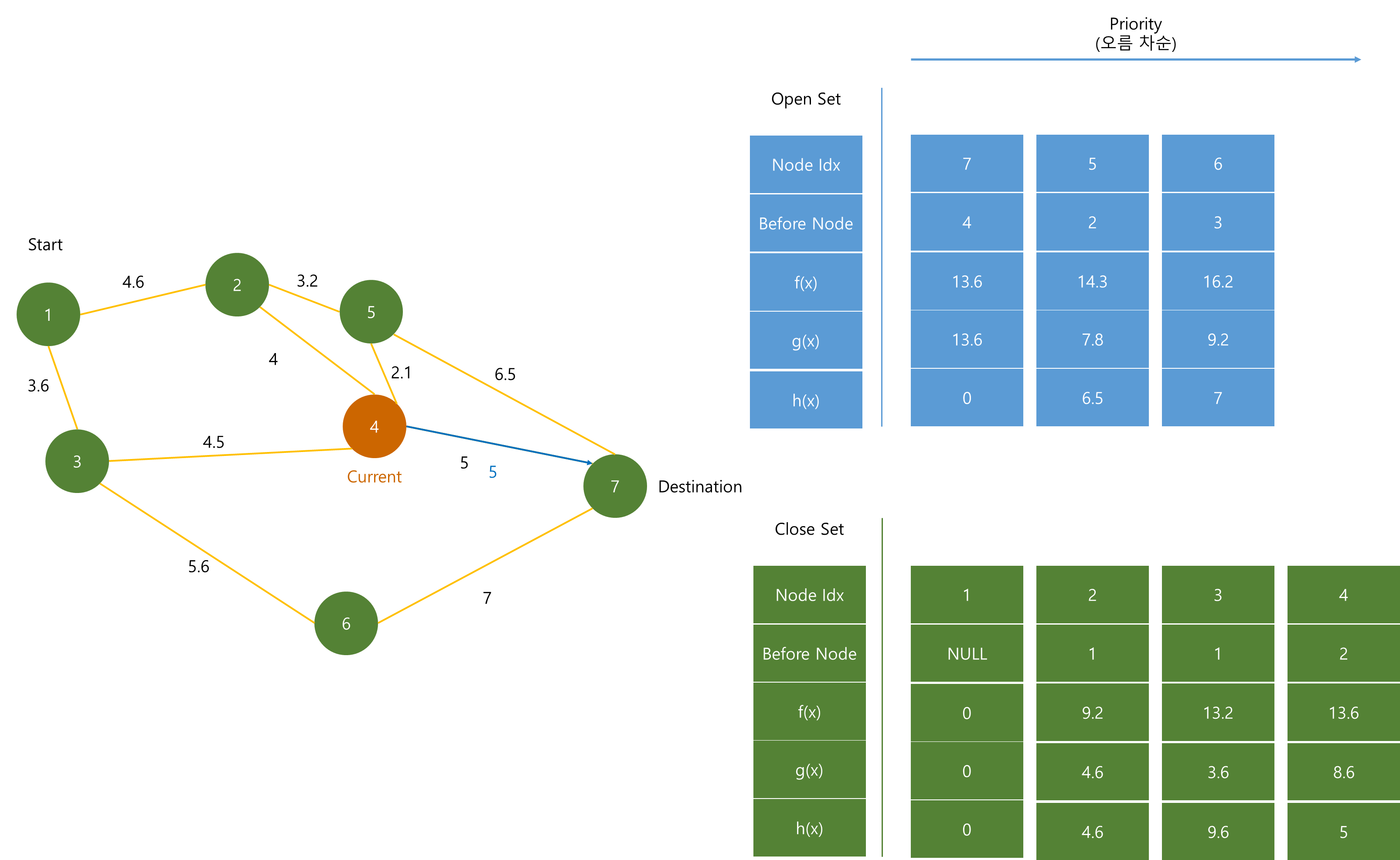 Priority Queue에서 가장 작은 f(x)인 (4) 노드가 pop 된 후 Close Set에 저장된다.